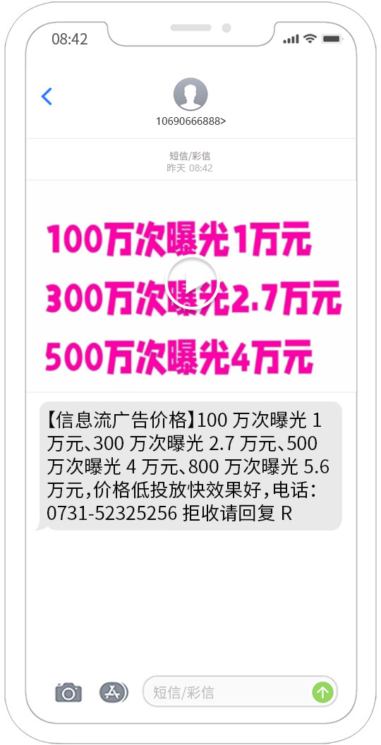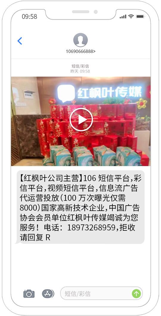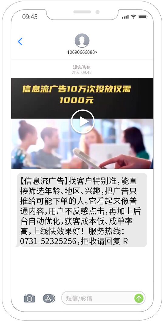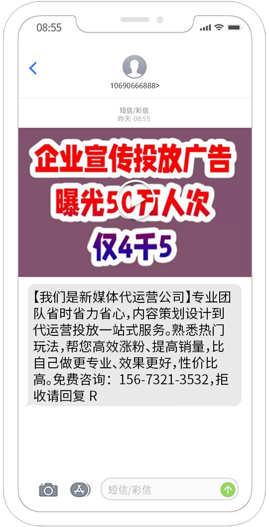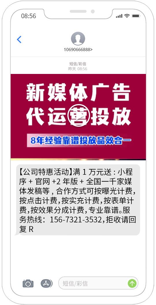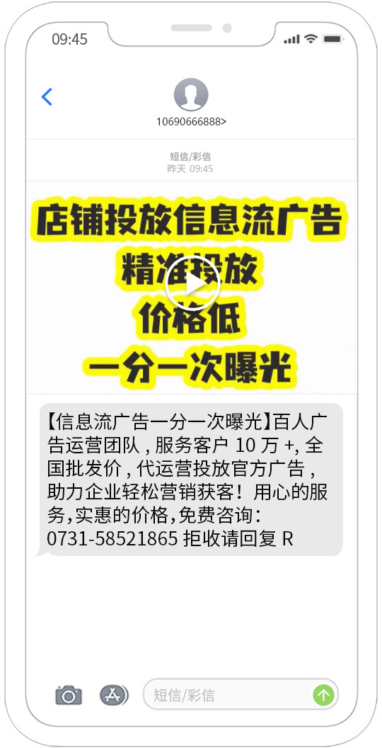 視頻短信發(fā)送能夠覆蓋移動(dòng)、聯(lián)通、電信用戶,正規(guī)集團(tuán)視頻短信通道,快速、可靠、穩(wěn)定、形象好,能快速將您的訊息投放到用戶的手機(jī)。